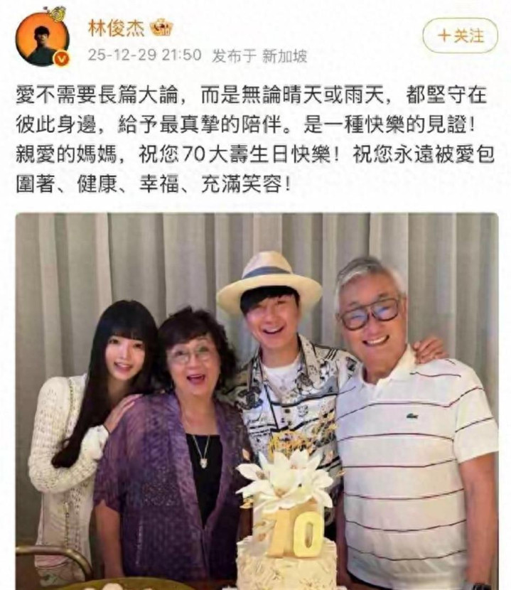 官宣的场合选在了林妈妈70岁的寿宴上。 一张温馨的家庭合照里,七七自然地依偎在林俊杰母亲的肩头,笑容甜美。 林俊杰站在一旁,画面里的松弛感和幸福感几乎要溢出屏幕。