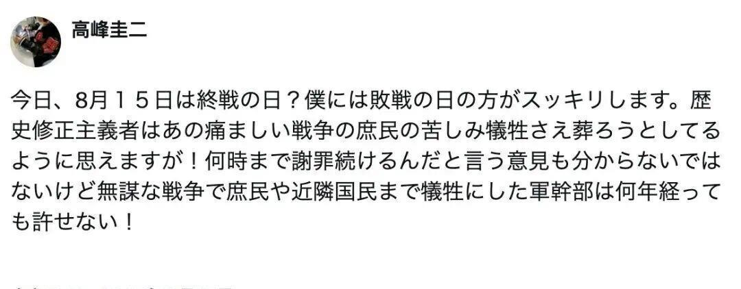 日本网民评价:「私は高峰さんの意見に賛成します。両国が交戦することに何かメリットがありますか。いや…不幸をもたらすだけだ!」“我赞同高峰先生的观点。两国交战能有什么好处呢?不……只会带来不幸!”「こんなピュアな理、高市政権はどうして分からないのですか。唯一考えられるのが、自民党の政治家がこの紛争の中でなにか得を得るしかない!」“这么简单纯粹的道理,高市政权为什么就不明白?唯一能想到的是,自民党的政客们只想在这场纷争中捞取好处!”等「戦争の意味がわかりません。今の社会では特にそうです。かつてはエネルギーや人口で戦争の意味を決めていましたが、今は何の意味があるのでしょうか。経済がグローバル化するのに、なぜ戦争をするのでしょうか。」などの声が寄せられたことを紹介した。“我无法理解战争的意义,如今的社会尤其如此。过去,战争的意义往往由能源和人口来决定,但现在它还有什么意义呢?既然经济已经全球化了,为什么还要发动战争呢?”这已经不是高峰圭二第一次这么发言了,在今年的“日本战败投降日”的时候,高峰圭二就发言:
